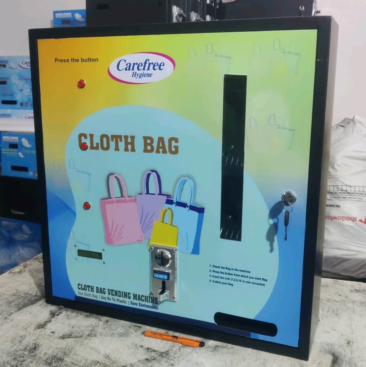 Cloth bag Vending machine used in super Mart, malls, Railway Station, public places.In which you can insert the coin in machine .it will dispense cloth bag